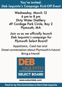 Beth Davis (my wife/boss) and I hope to catch up with you Wednesday night at the campaign kickoff for Deb Iaquinto, who is running for Plymouth Select Board at the local election, May 17th.